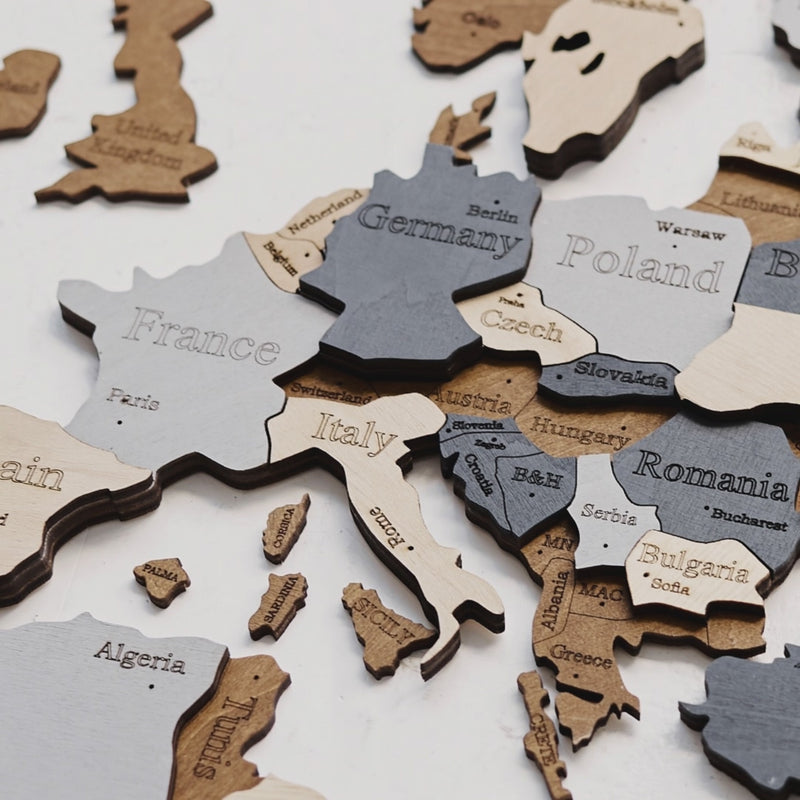 Ręcznie wykonane z premium sklejki brzozowej, nasze 3D drewniane mapy świata łączą ponadczasowy design z inspiracją do podróży. Dostępne w trzech wariantach kolorystycznych (Natural Wood / Multicolor / Dark Brown z grafitem) oraz w 8 językach (EN, ES, DE, FR, IT, PL, NL, SV), to drewniane dekoracje ścienne do salonu, sypialni, biura, kawiarni i hotelowego lobby.
